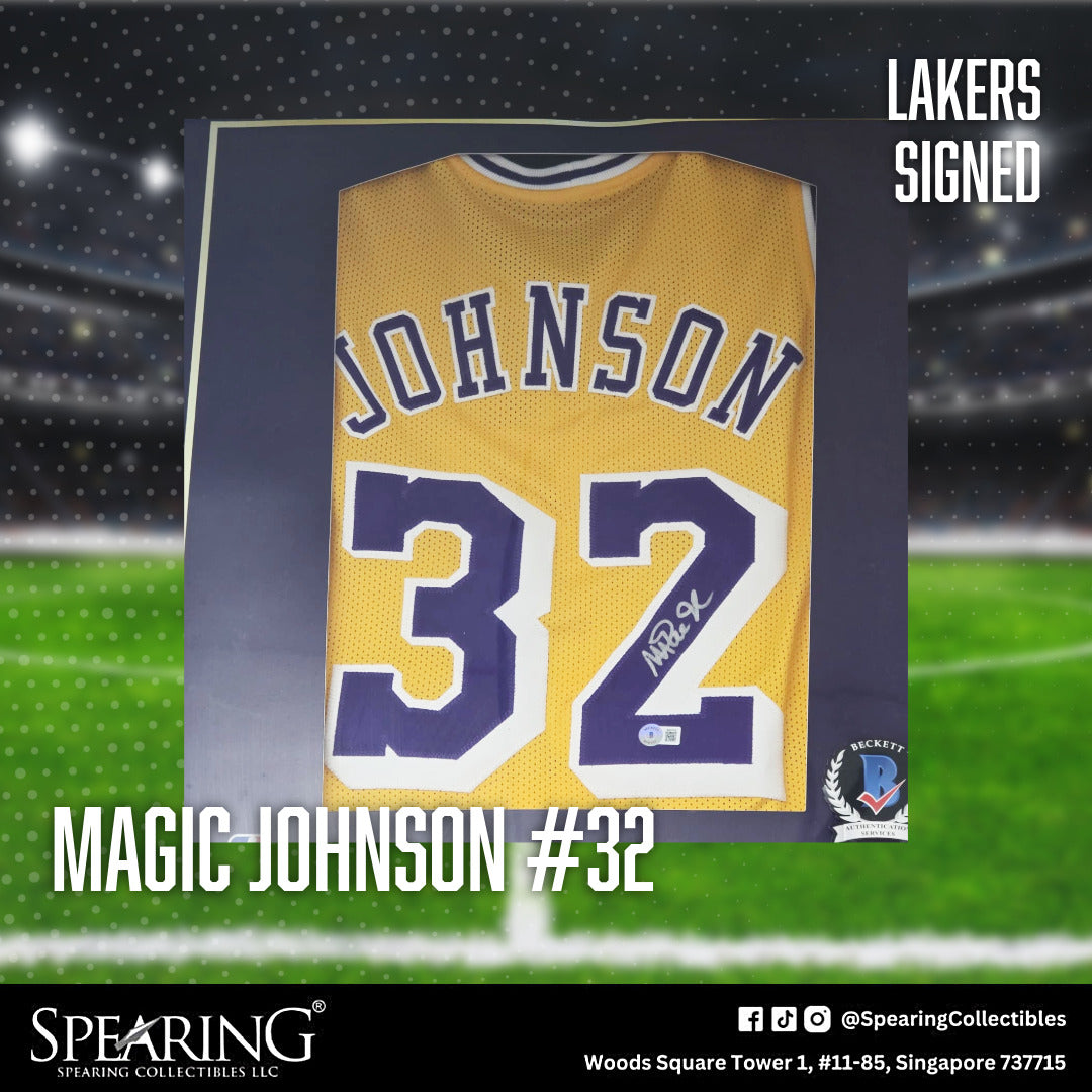 Authentic Magic Johnson #32 Lakers jersey, personally signed by the legendary point guard. A centerpiece item for any basketball or Lakers collection.
